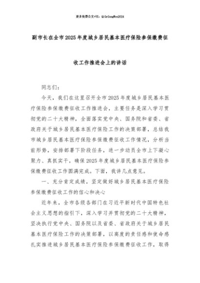 【七哥公文】2024年:副市长在全市2025年度城乡居民基本医疗保险参保缴费征收工作推进会上的讲话+更多免费公文+VX:QiGeGongWen2024