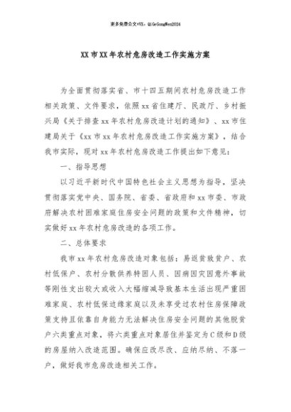 / 【七哥公文】2024年:XX市XX年农村危房改造工作实施方案+更多免费公文+VX:QiGeGongWen2024