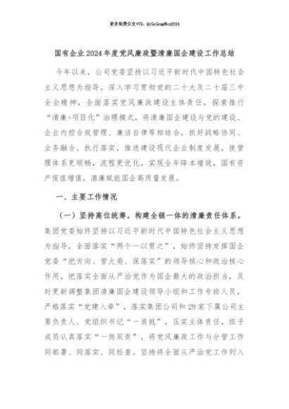 【七哥公文】2024年:国有企业2024年度党风廉政暨清廉国企建设工作总结+更多免费公文+VX:QiGeGongWen2024