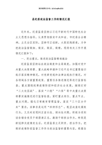 / 【七哥公文】2024年:县纪委政治监督工作的情况汇报+更多免费公文+VX:QiGeGongWen2024