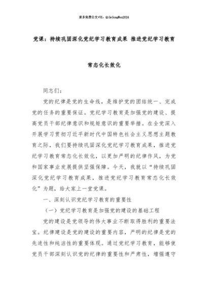 【七哥公文】2024年:党课:持续巩固深化党纪学习教育成果 推进党纪学习教育常态化长效化 (1)+更多免费公文+VX:QiGeGongWen2024