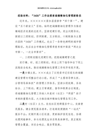 【七哥公文】2024年:经验材料:“3456”工作法探索城镇精细化管理新路径+更多免费公文+VX:QiGeGongWen2024