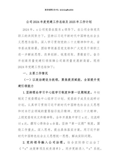 【七哥公文】2024年:公司2024年度党建工作总结及2025年工作计划 (1)+更多免费公文+VX:QiGeGongWen2024