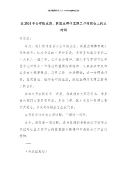 【七哥公文】2024年:在2024年全市新业态、新就业群体党建工作推进会上的主持词+更多免费公文+VX:QiGeGongWen2024