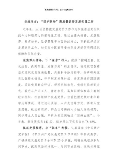 / 【七哥公文】2024年:交流发言:“四步联动”高质量抓好发展党员工作+更多免费公文+VX:QiGeGongWen2024