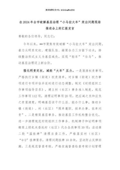 【七哥公文】2024年:在2024年全市破解基层治理“小马拉大车”突出问题现场推进会上的汇报发言+更多免费公文+VX:QiGeGongWen2024