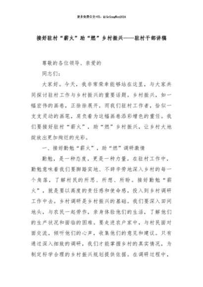 / 【七哥公文】2024年:接好驻村“薪火”助“燃”乡村振兴——驻村干部讲稿+更多免费公文+VX:QiGeGongWen2024