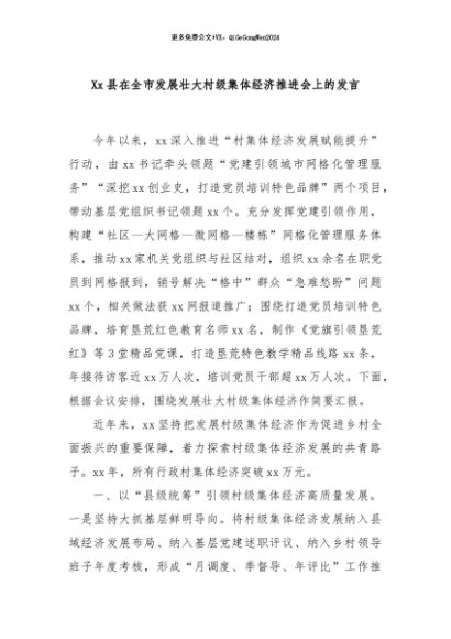 / 【七哥公文】2024年:Xx县在全市发展壮大村级集体经济推进会上的发言+更多免费公文+VX:QiGeGongWen2024