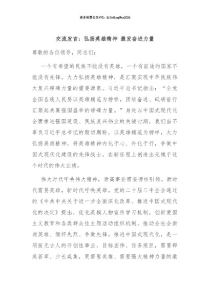 / 【七哥公文】2024年:交流发言:弘扬英雄精神 激发奋进力量+更多免费公文+VX:QiGeGongWen2024