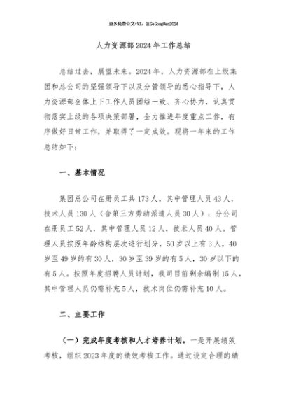 / 【七哥公文】2024年:人力资源部2024年工作总结+更多免费公文+VX:QiGeGongWen2024