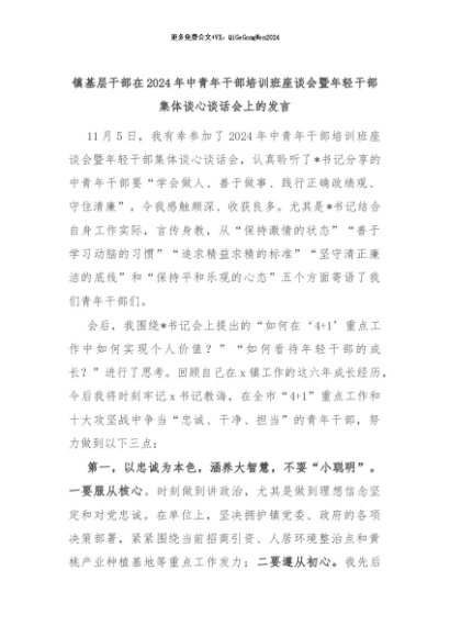 【七哥公文】2024年:镇基层干部在2024年中青年干部培训班座谈会暨年轻干部集体谈心谈话会上的发言+更多免费公文+VX:QiGeGongWen2024