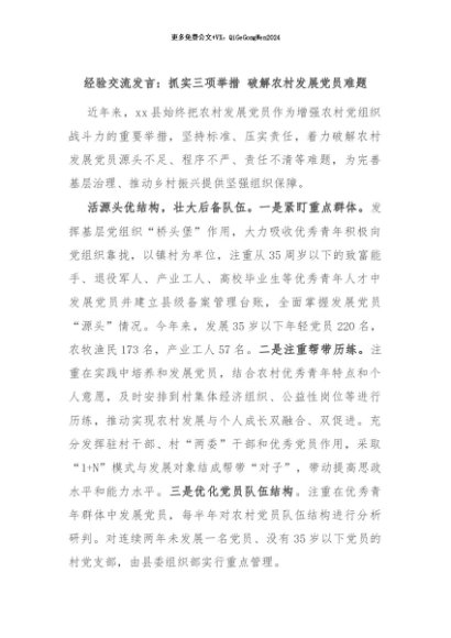 / 【七哥公文】2024年:经验交流发言:抓实三项举措 破解农村发展党员难题+更多免费公文+VX:QiGeGongWen2024