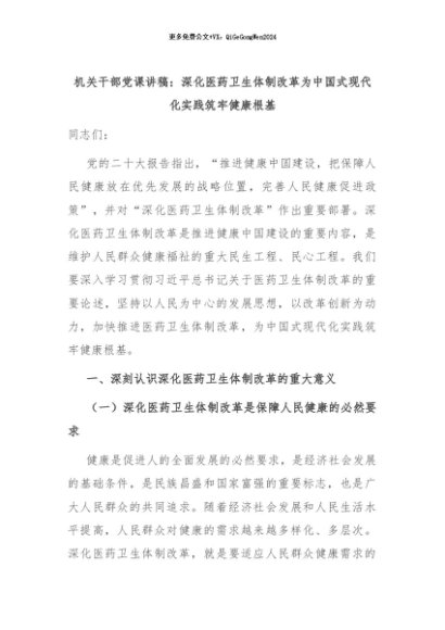 【七哥公文】2024年:机关干部党课讲稿:深化医药卫生体制改革为中国式现代化实践筑牢健康根基+更多免费公文+VX:QiGeGongWen2024