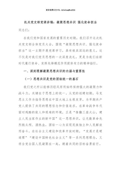 / 【七哥公文】2024年:机关党支部党课讲稿:凝聚思想共识 强化使命担当+更多免费公文+VX:QiGeGongWen2024