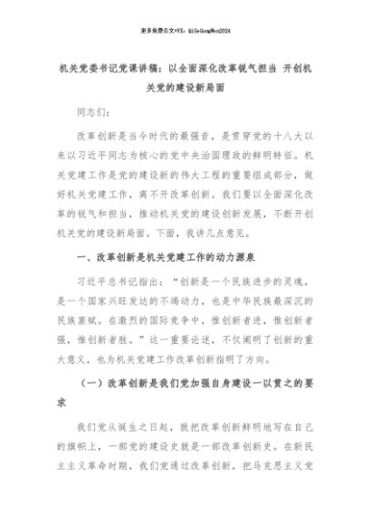 【七哥公文】2024年:机关党委书记党课讲稿:以全面深化改革锐气担当 开创机关党的建设新局面+更多免费公文+VX:QiGeGongWen2024