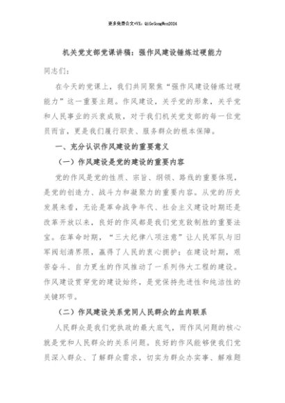 / 【七哥公文】2024年:机关党支部党课讲稿:强作风建设锤炼过硬能力+更多免费公文+VX:QiGeGongWen2024
