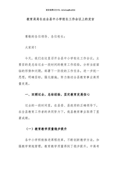 / 【七哥公文】2024年:教育局局长在全县中小学校长工作会议上的发言+更多免费公文+VX:QiGeGongWen2024