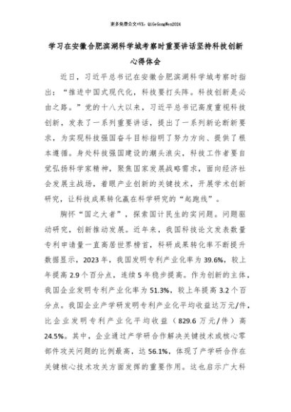【七哥公文】2024年:学习在安徽合肥滨湖科学城考察时重要讲话坚持科技创新心得体会+更多免费公文+VX:QiGeGongWen2024