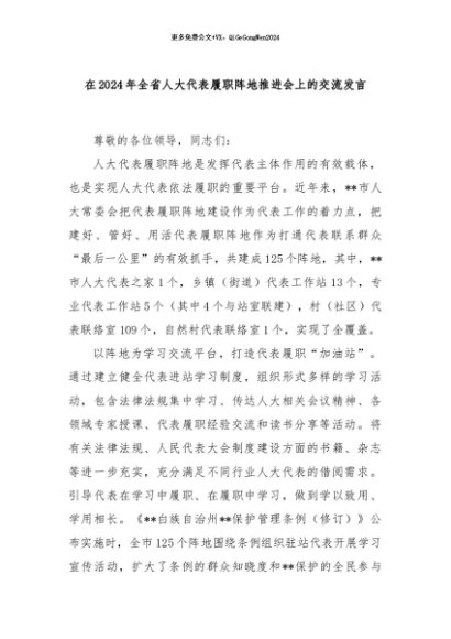 【七哥公文】2024年:在2024年全省人大代表履职阵地推进会上的交流发言 (1)+更多免费公文+VX:QiGeGongWen2024