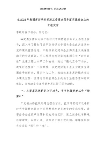 【七哥公文】2024年:在2024年集团第四季度党建工作重点任务落实推进会上的汇报发言+更多免费公文+VX:QiGeGongWen2024