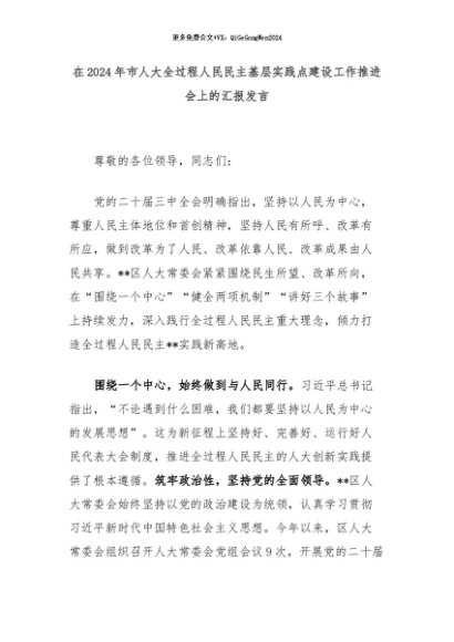 【七哥公文】2024年:在2024年市人大全过程人民民主基层实践点建设工作推进会上的汇报发言+更多免费公文+VX:QiGeGongWen2024