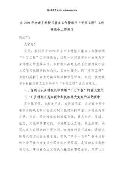 【七哥公文】2024年:在2024年全市乡村振兴重点工作暨学用“千万工程”工作推进会上的讲话+更多免费公文+VX:QiGeGongWen2024