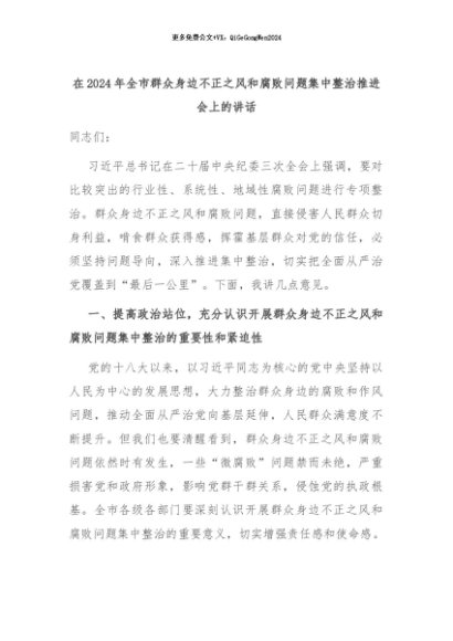 【七哥公文】2024年:在2024年全市群众身边不正之风和腐败问题集中整治推进会上的讲话+更多免费公文+VX:QiGeGongWen2024