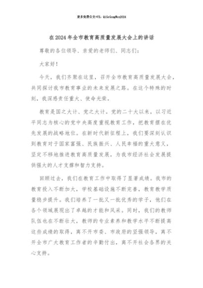 / 【七哥公文】2024年:在2024年全市教育高质量发展大会上的讲话+更多免费公文+VX:QiGeGongWen2024