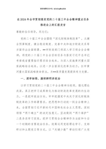 【七哥公文】2024年:在2024年全市贯彻落实党的二十届三中全会精神重点任务推进会上的汇报发言+更多免费公文+VX:QiGeGongWen2024