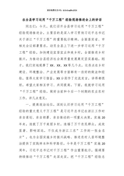 / 【七哥公文】2024年:在全县学习运用“千万工程”经验现场推进会上的讲话+更多免费公文+VX:QiGeGongWen2024