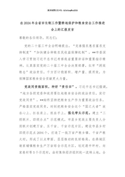 【七哥公文】2024年:在2024年全省田长制工作暨耕地保护和粮食安全工作推进会上的汇报发言+更多免费公文+VX:QiGeGongWen2024