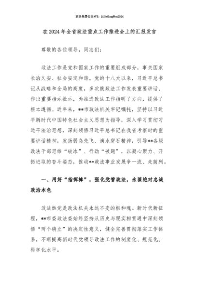 / 【七哥公文】2024年:在2024年全省政法重点工作推进会上的汇报发言+更多免费公文+VX:QiGeGongWen2024