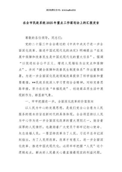 【七哥公文】2024年:在全市民政系统2025年重点工作谋划会上的汇报发言+更多免费公文+VX:QiGeGongWen2024
