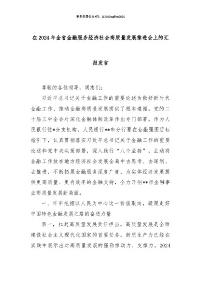 【七哥公文】2024年:在2024年全省金融服务经济社会高质量发展推进会上的汇报发言+更多免费公文+VX:QiGeGongWen2024