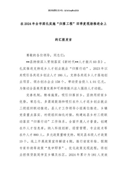 【七哥公文】2024年:在2024年全市深化实施“归雁工程”四季度现场推进会上的汇报发言+更多免费公文+VX:QiGeGongWen2024