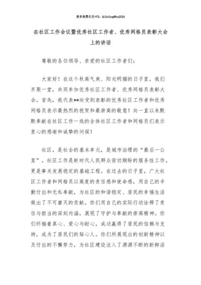 【七哥公文】2024年:在社区工作会议暨优秀社区工作者、优秀网格员表彰大会上的讲话+更多免费公文+VX:QiGeGongWen2024
