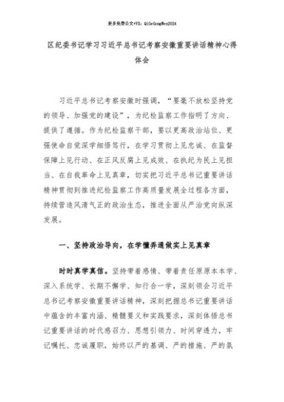 【七哥公文】2024年:区纪委书记学习习近平总书记考察安徽重要讲话精神心得体会+更多免费公文+VX:QiGeGongWen2024