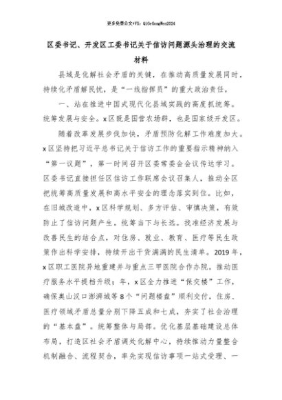 【七哥公文】2024年:区委书记、开发区工委书记关于信访问题源头治理的交流材料+更多免费公文+VX:QiGeGongWen2024