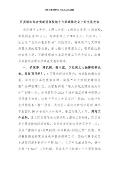 【七哥公文】2024年:区委组织部在党建引领校地合作共建推进会上的交流发言+更多免费公文+VX:QiGeGongWen2024
