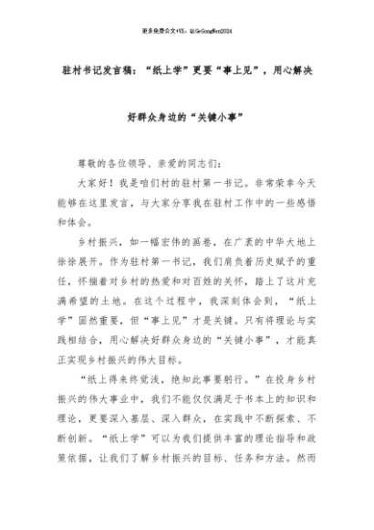 【七哥公文】2024年:驻村书记发言稿:“纸上学”更要“事上见”,用心解决好群众身边的“关键小事”+更多免费公文+VX:QiGeGongWen2024