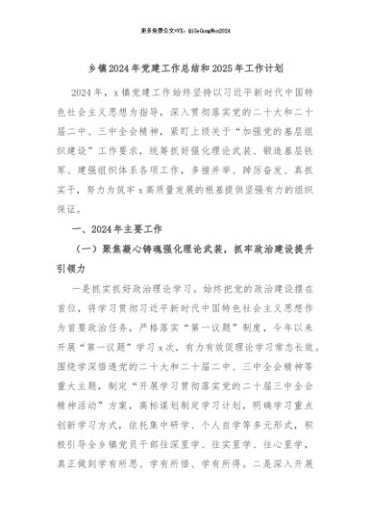 / 【七哥公文】2024年:乡镇2024年党建工作总结和2025年工作计划+更多免费公文+VX:QiGeGongWen2024