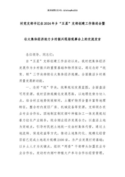 【七哥公文】2024年:村党支部书记在2024年乡“五星”支部创建工作推进会暨壮大集体经济助力乡村振兴现场观摩会上的交流发言+更多免费公文+VX:QiGeGongWen2024
