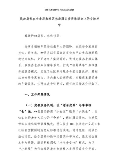 【七哥公文】2024年:民政局长在全市居家社区养老服务发展推进会上的交流发言+更多免费公文+VX:QiGeGongWen2024