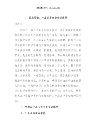 / 【七哥公文】2024年:民政局长二十届三中全会宣讲提纲+更多免费公文+VX:QiGeGongWen2024