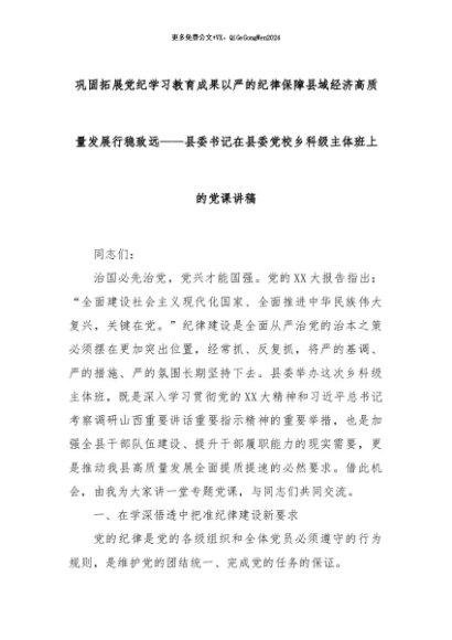 【七哥公文】2024年:巩固拓展党纪学习教育成果以严的纪律保障县域经济高质量发展行稳致远+更多免费公文+VX:QiGeGongWen2024
