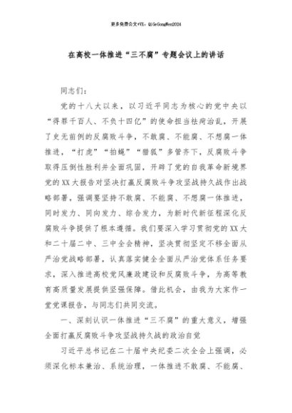 / 【七哥公文】2024年:在高校一体推进“三不腐”专题会议上的讲话+更多免费公文+VX:QiGeGongWen2024