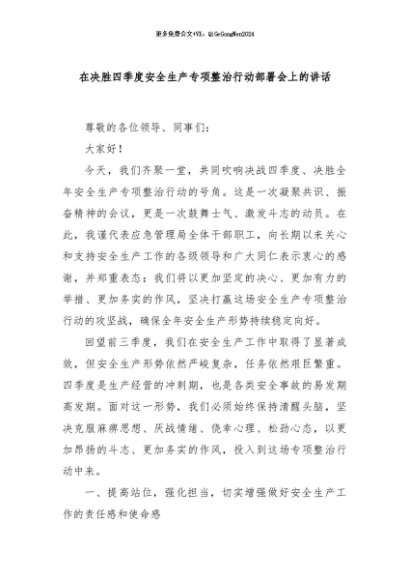 / 【七哥公文】2024年:在决胜四季度安全生产专项整治行动部署会上的讲话+更多免费公文+VX:QiGeGongWen2024