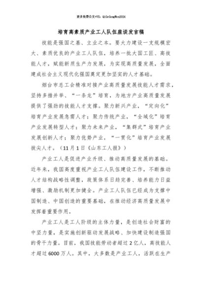 / 【七哥公文】2024年:培育高素质产业工人队伍座谈发言稿+更多免费公文+VX:QiGeGongWen2024