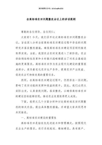 / 【七哥公文】2024年:在高标准农田问题整改会议上的讲话提纲+更多免费公文+VX:QiGeGongWen2024