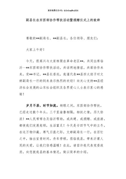 / 【七哥公文】2024年:副县长在东西部协作帮扶活动暨捐赠仪式上的致辞+更多免费公文+VX:QiGeGongWen2024